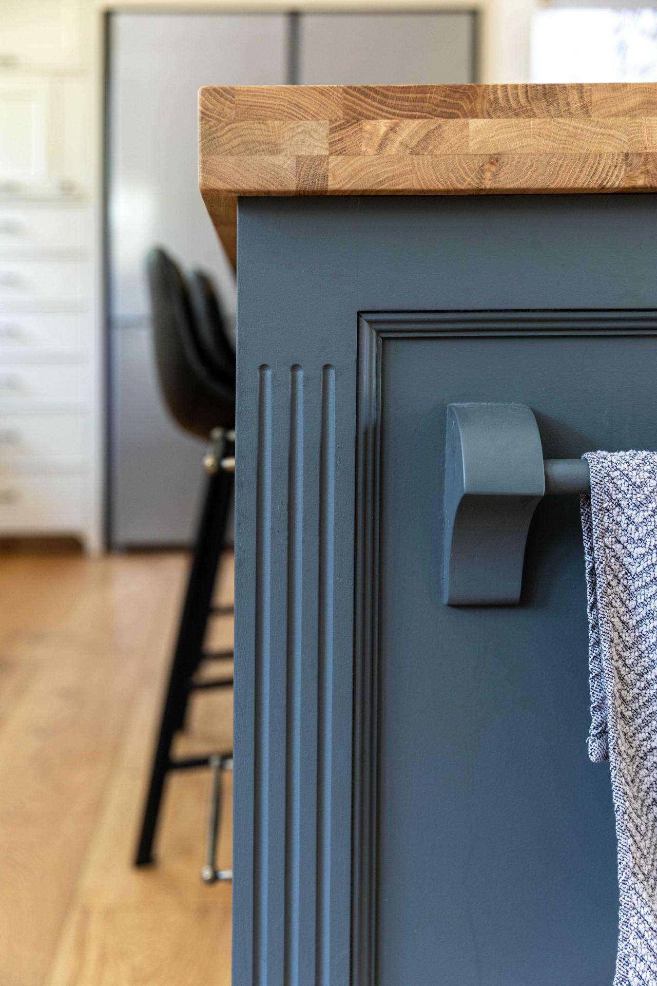בקומת הכניסה תוכנן מטבח גדול ורחב שנוגר עם תשומת לב קפדנית לכל פרט ופרט בו, עם הרבה מקומות אחסון, משטחי עבודה מרווחים ואי שמשמש גם כמקום אחסון. בסמוך אליו מוקמה פינת האוכל כך גם כשמארחים יש קירבה למטבח ולמבשלים בו.