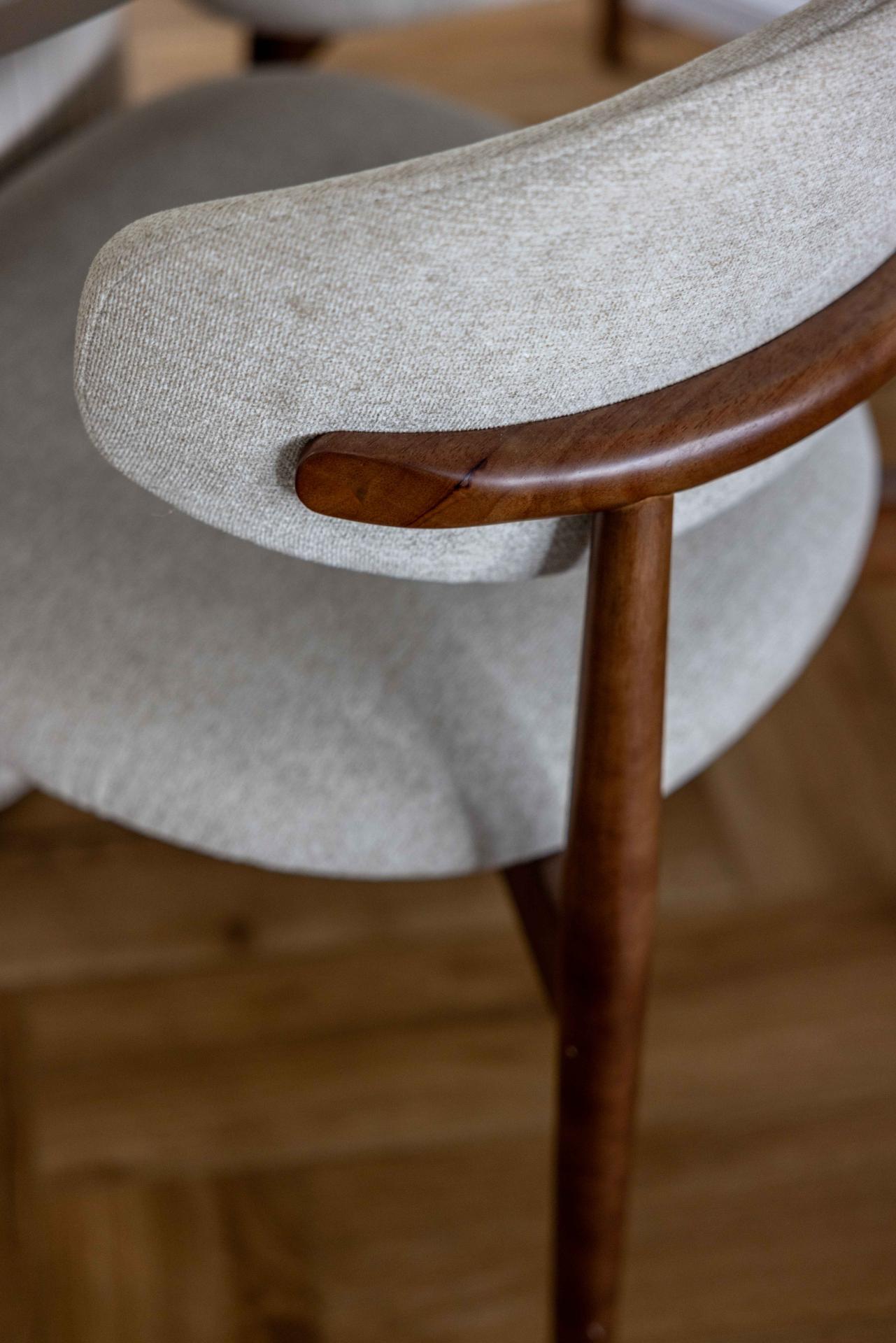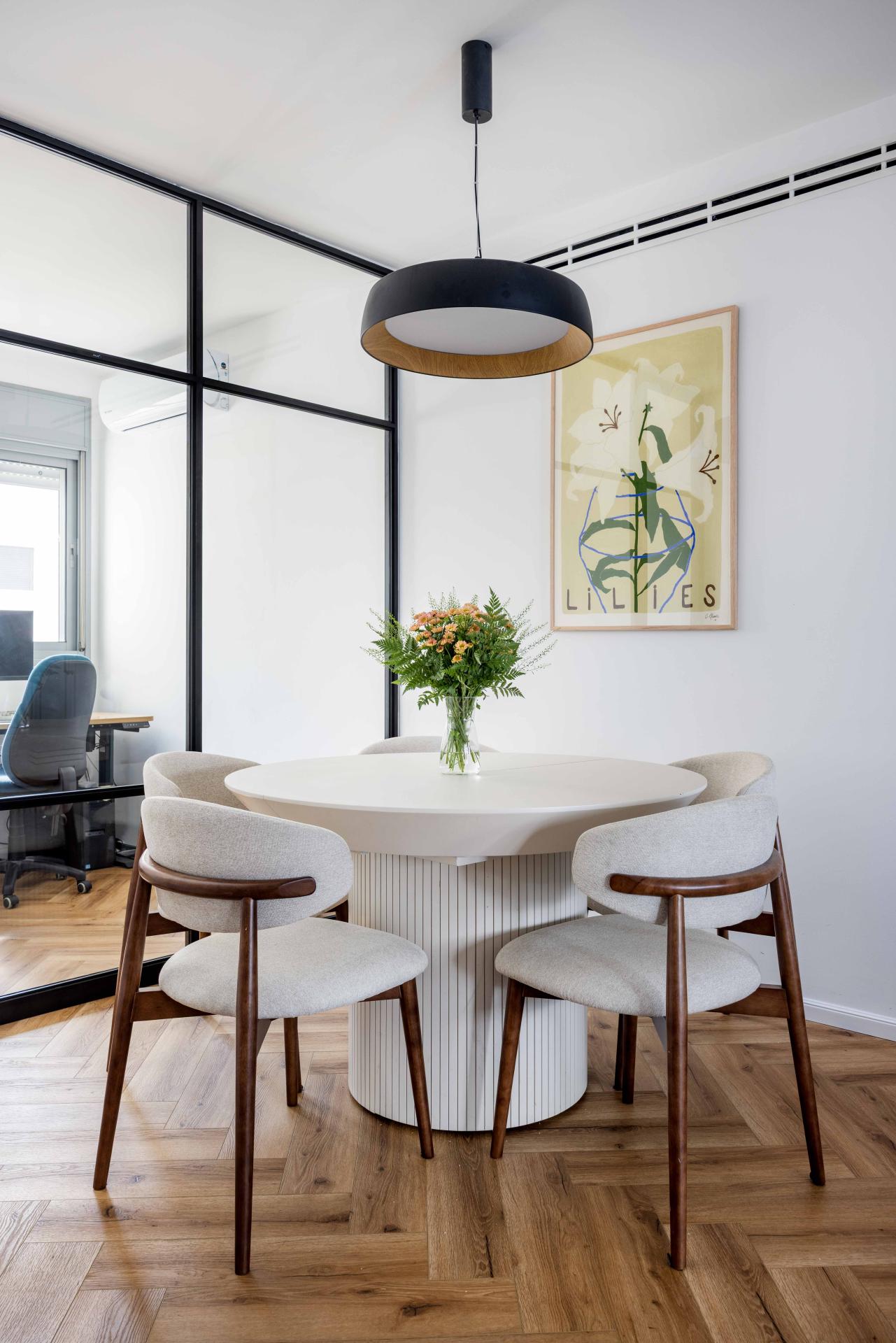 פינת האוכל מוקמה במרכז הבית ומשקיפה אל כל המרחב, מחברת באלגנטיות בין האזורים של המטבח והסלון ומדגישה את תחושת החום והמשפחתיות.