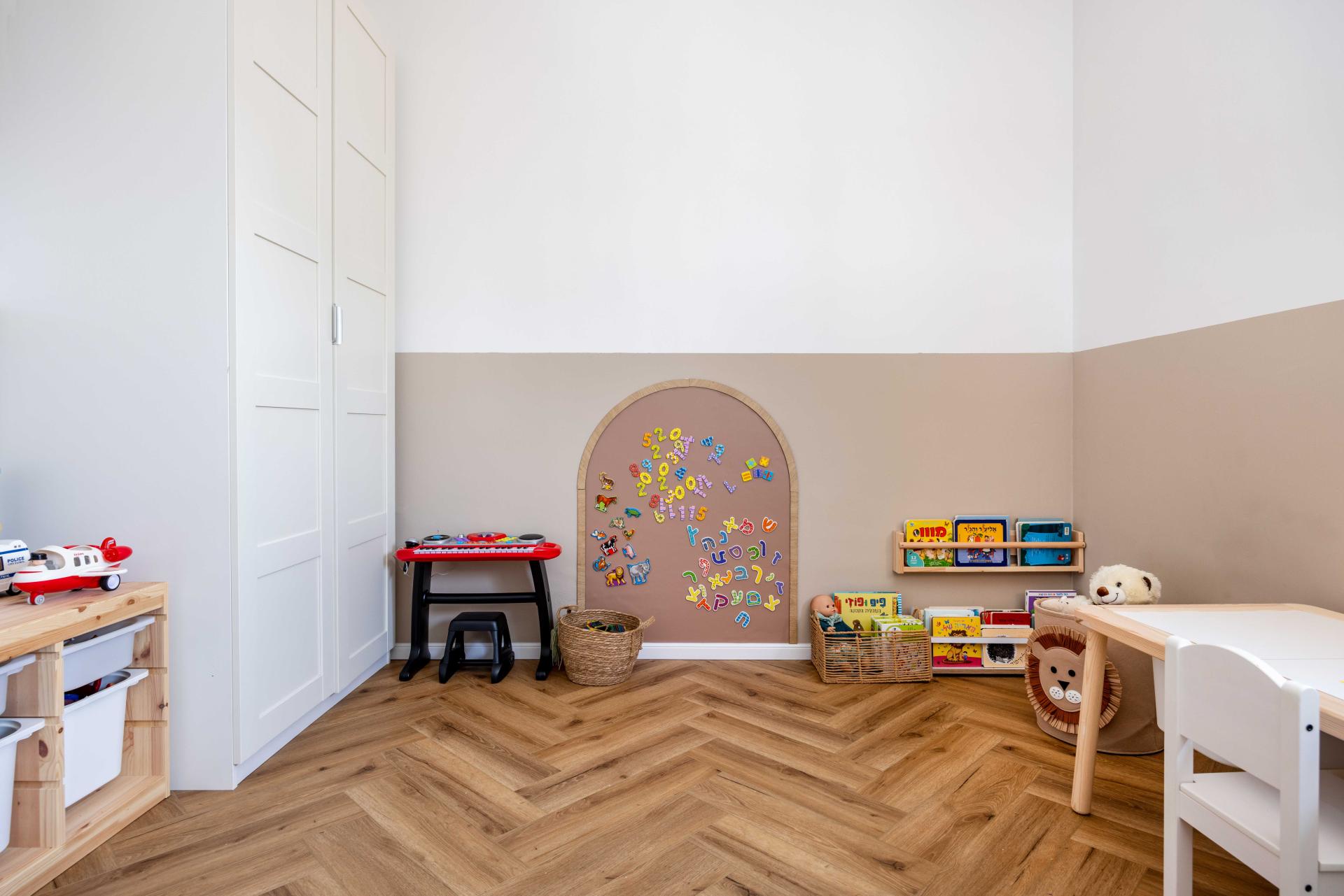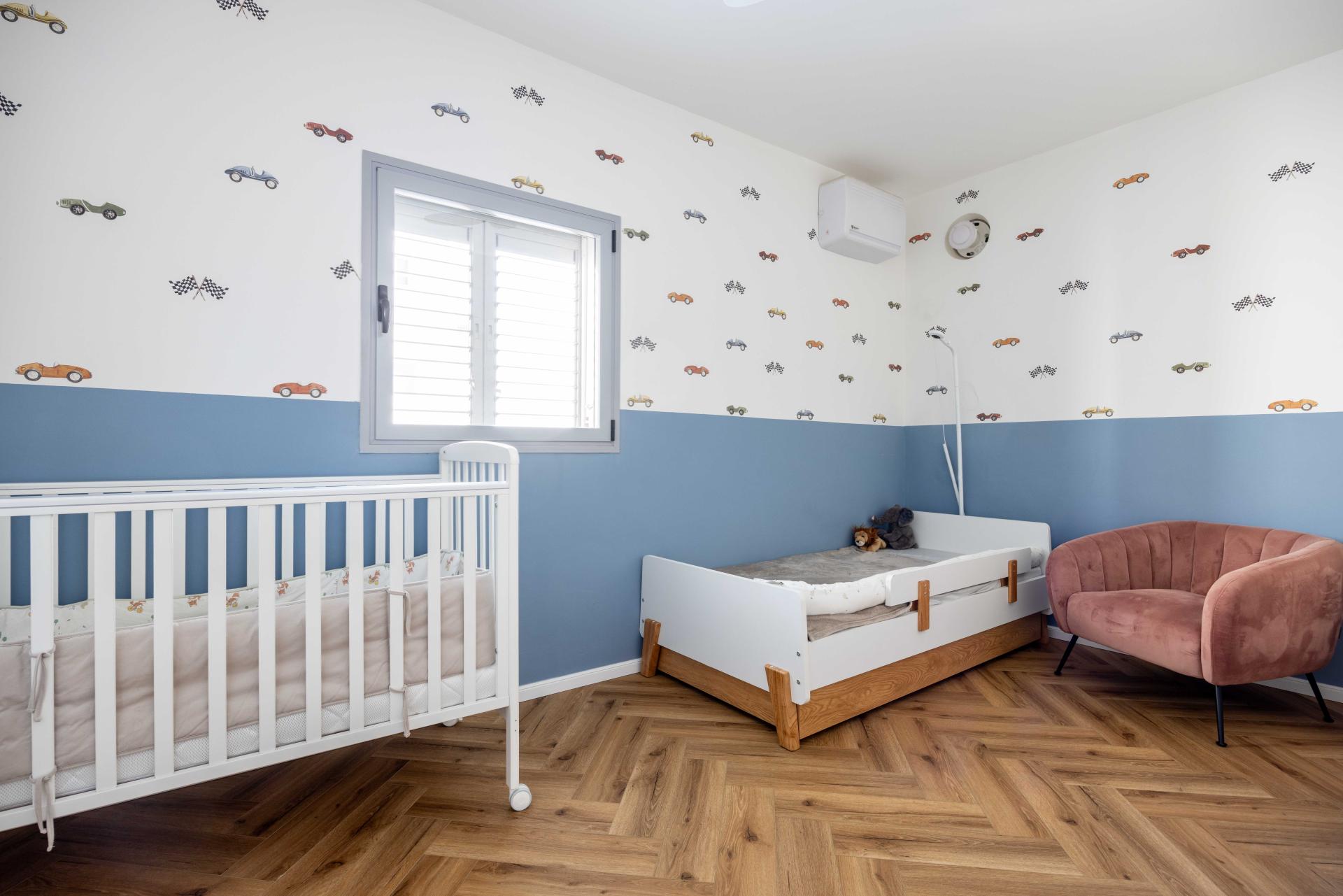יחידת ההורים עוצבה כמאסטר עם חדר רחצה מפנק ובאזור מופרד משאר חדרי הבית, חדרי המשחקים והשינה של הבן, קיבלו צבעוניות רכה ונעימה המותאמת לגילו.