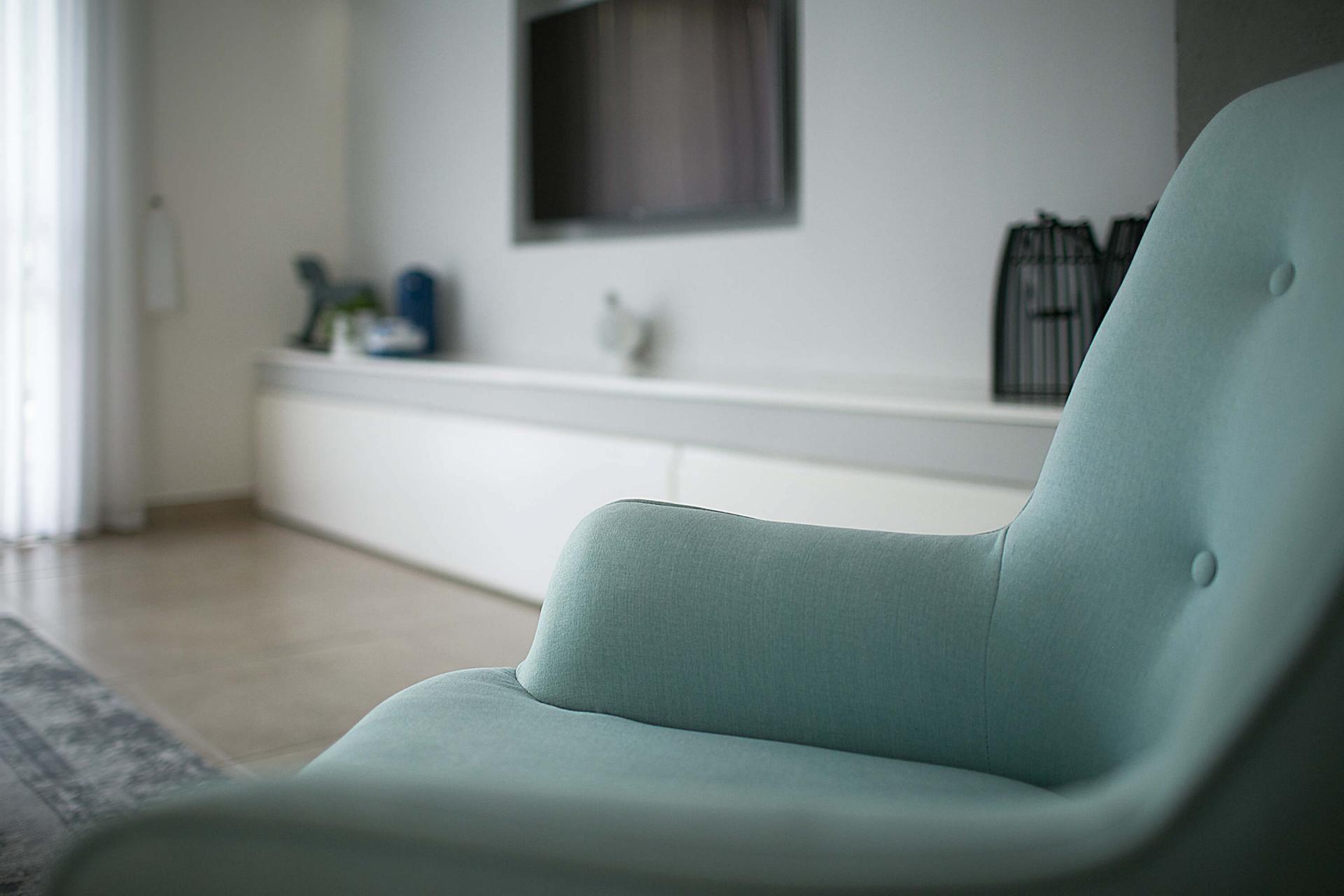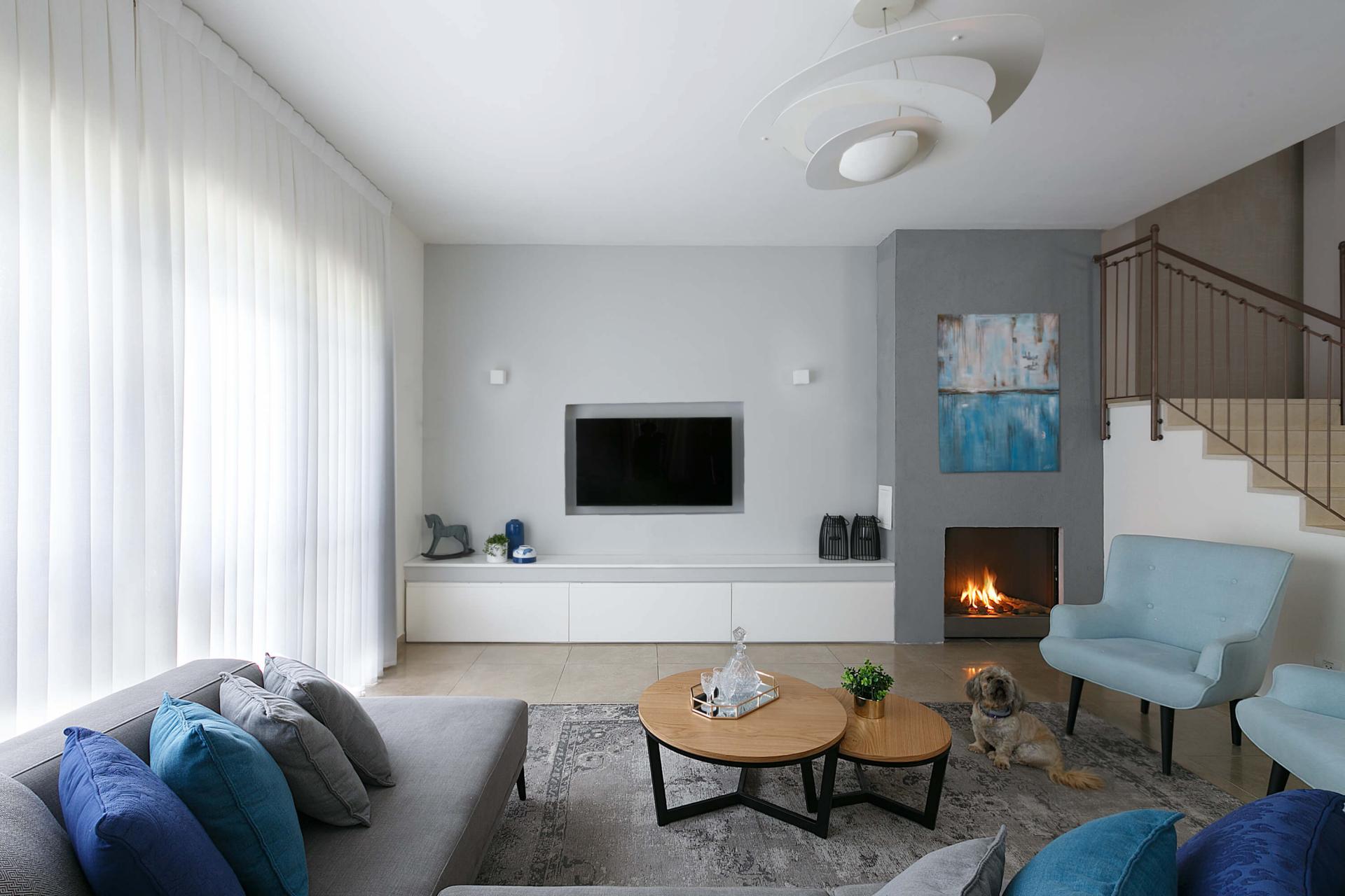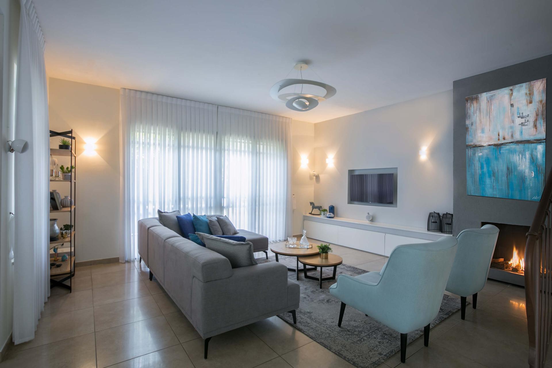 בשני ימי קניות ממוקדים נרכשו פריטים משובחים, במקביל בחרנו גוון ויישום מיוחד לקיר של הקמין ובשילוב של כל אלה יצרנו סלון נעים, רגוע והרמוני.