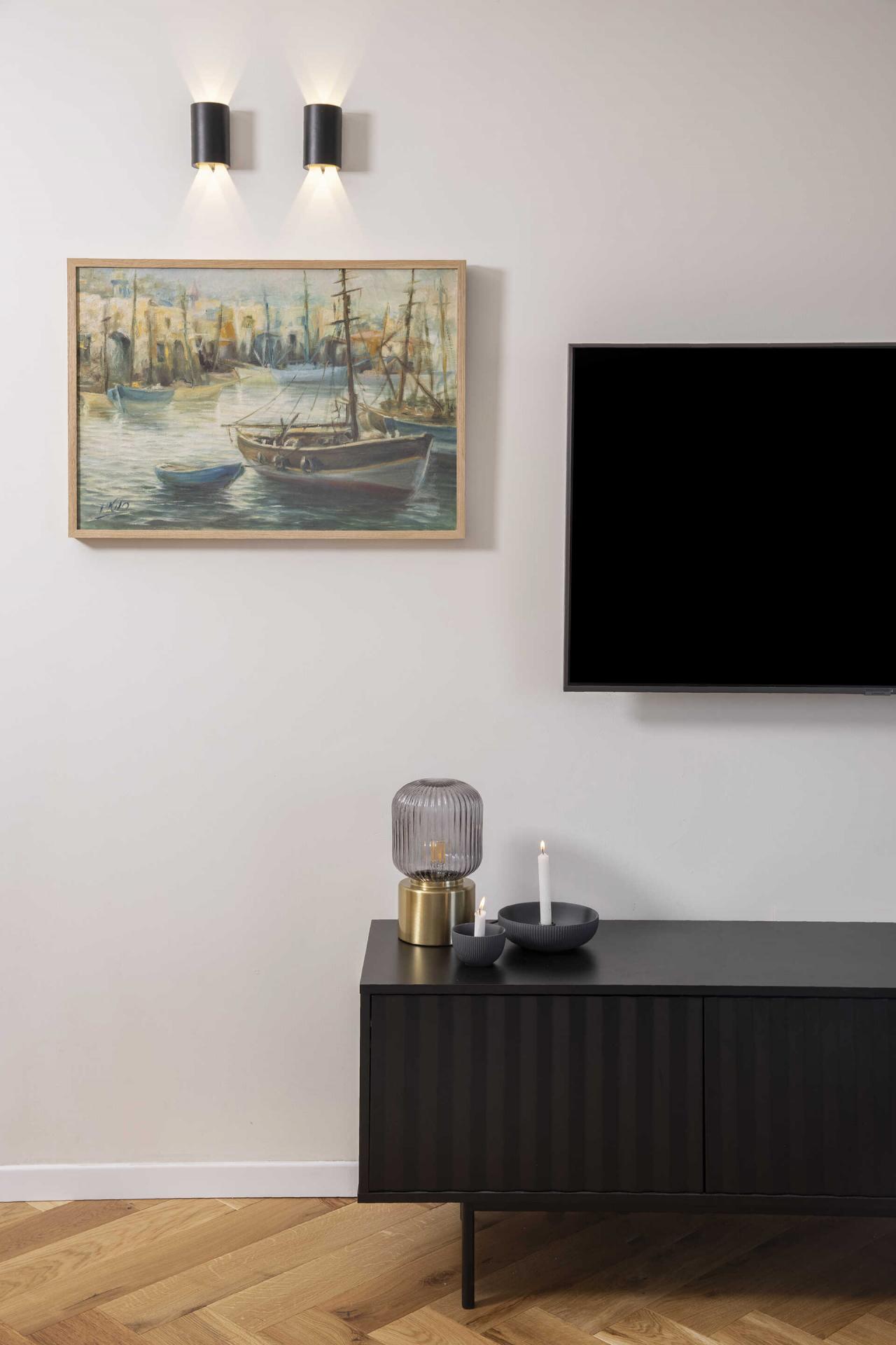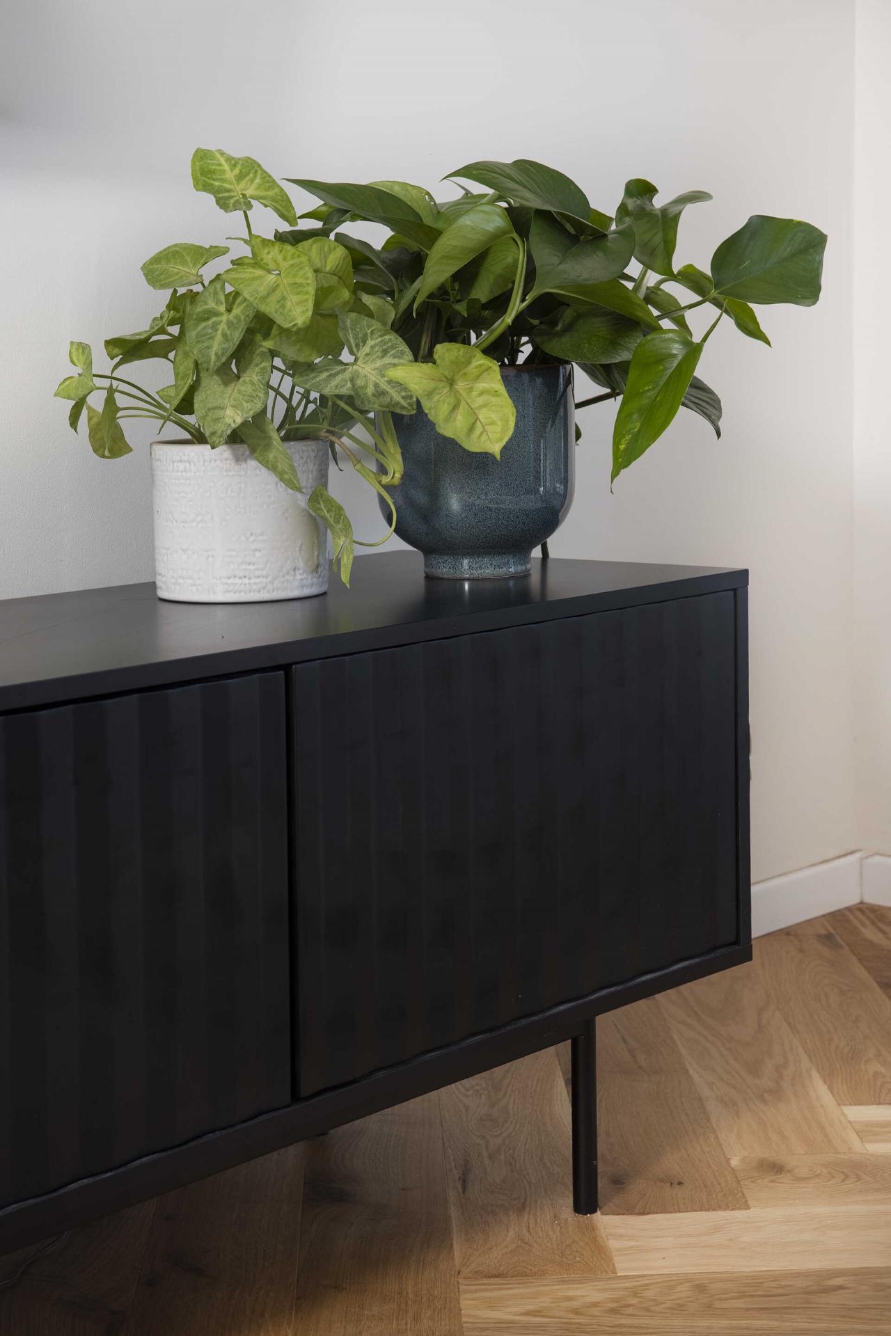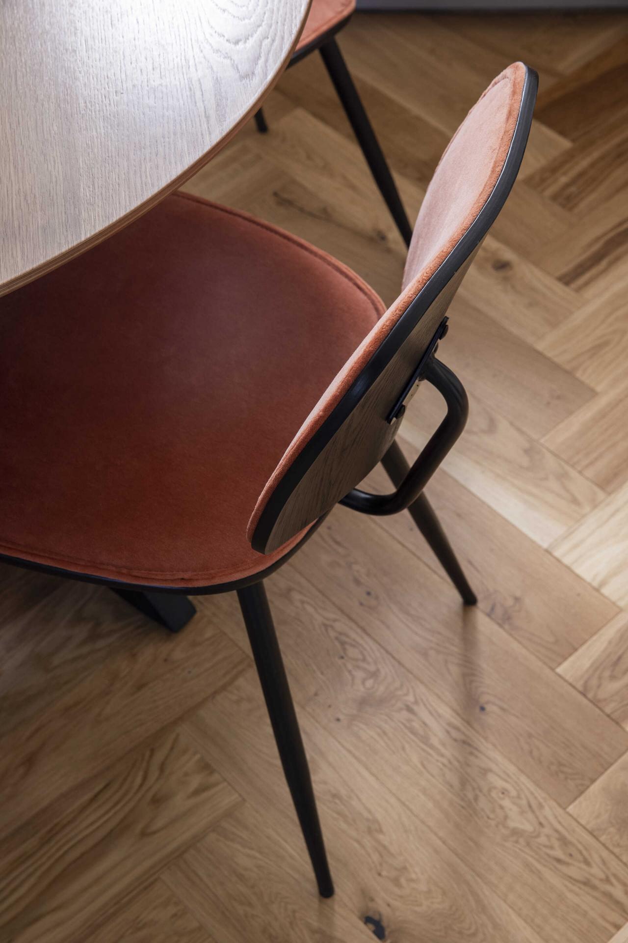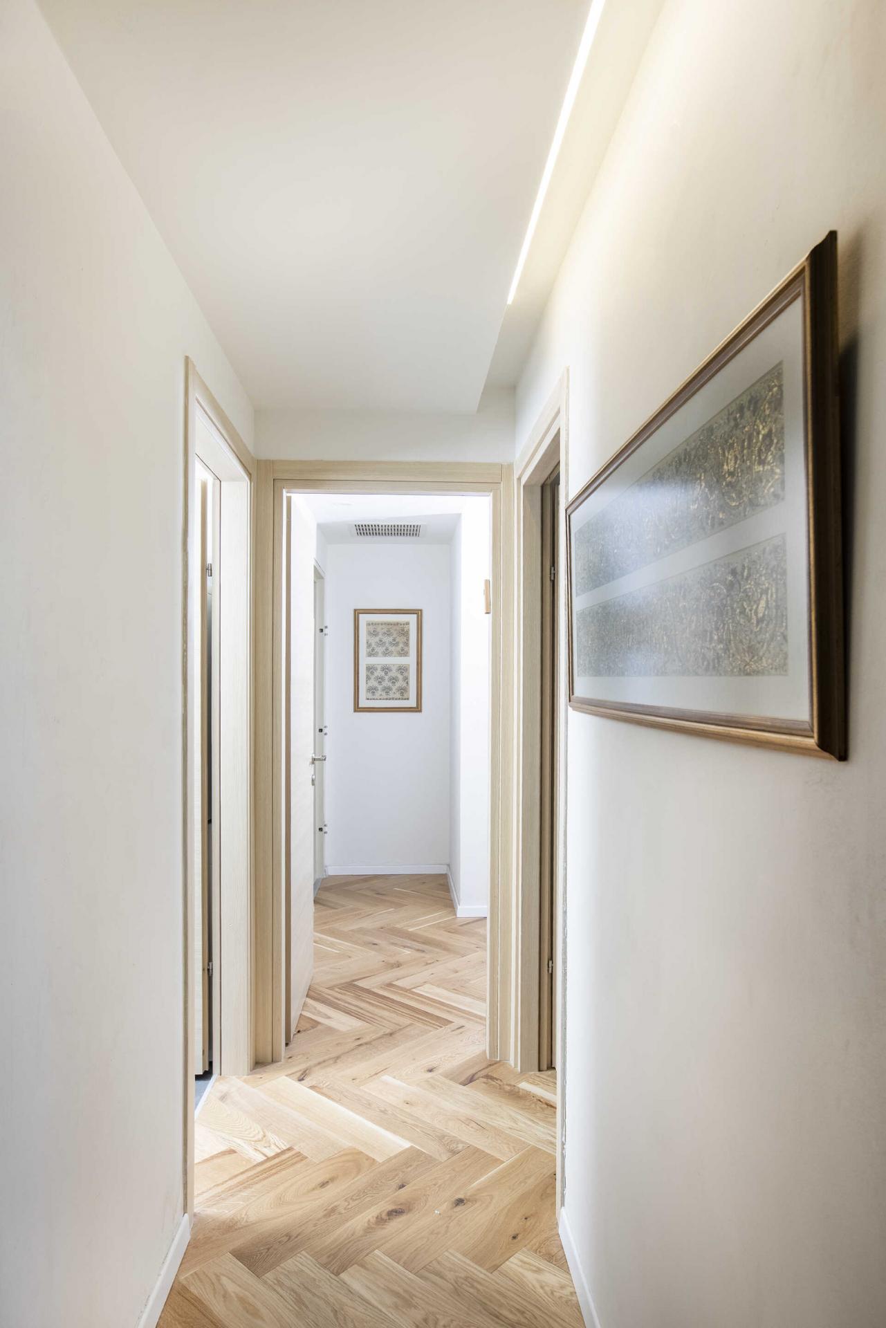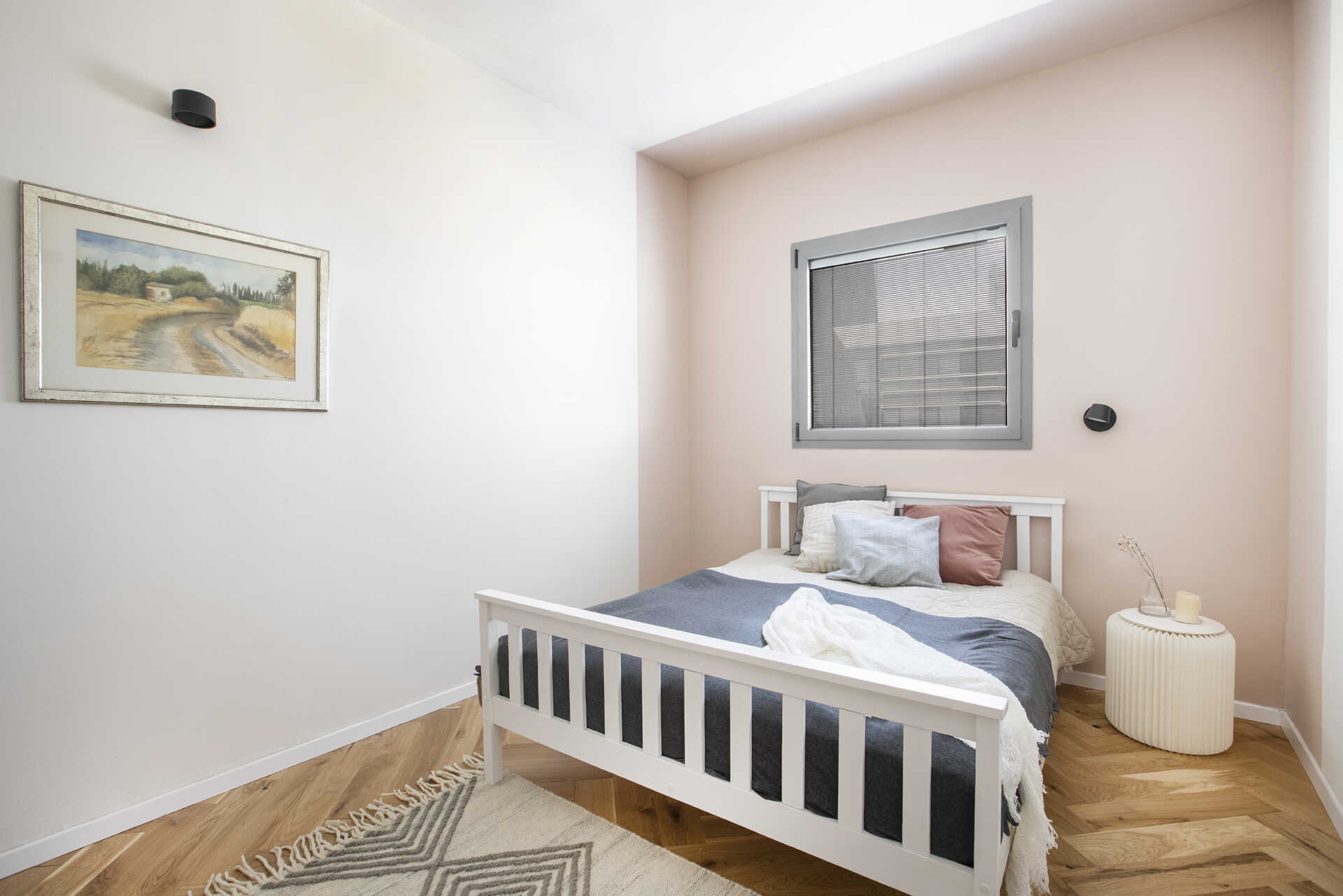 לזה הוספנו פרקט פישבון תלת שכבתי בכל רחבי הדירה, שמשמש רקע יפהפה לכל מה שהונח עליו.