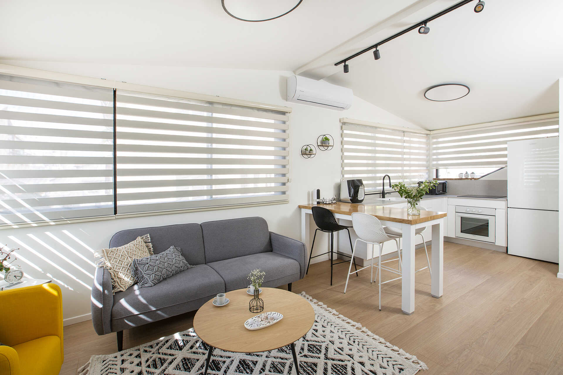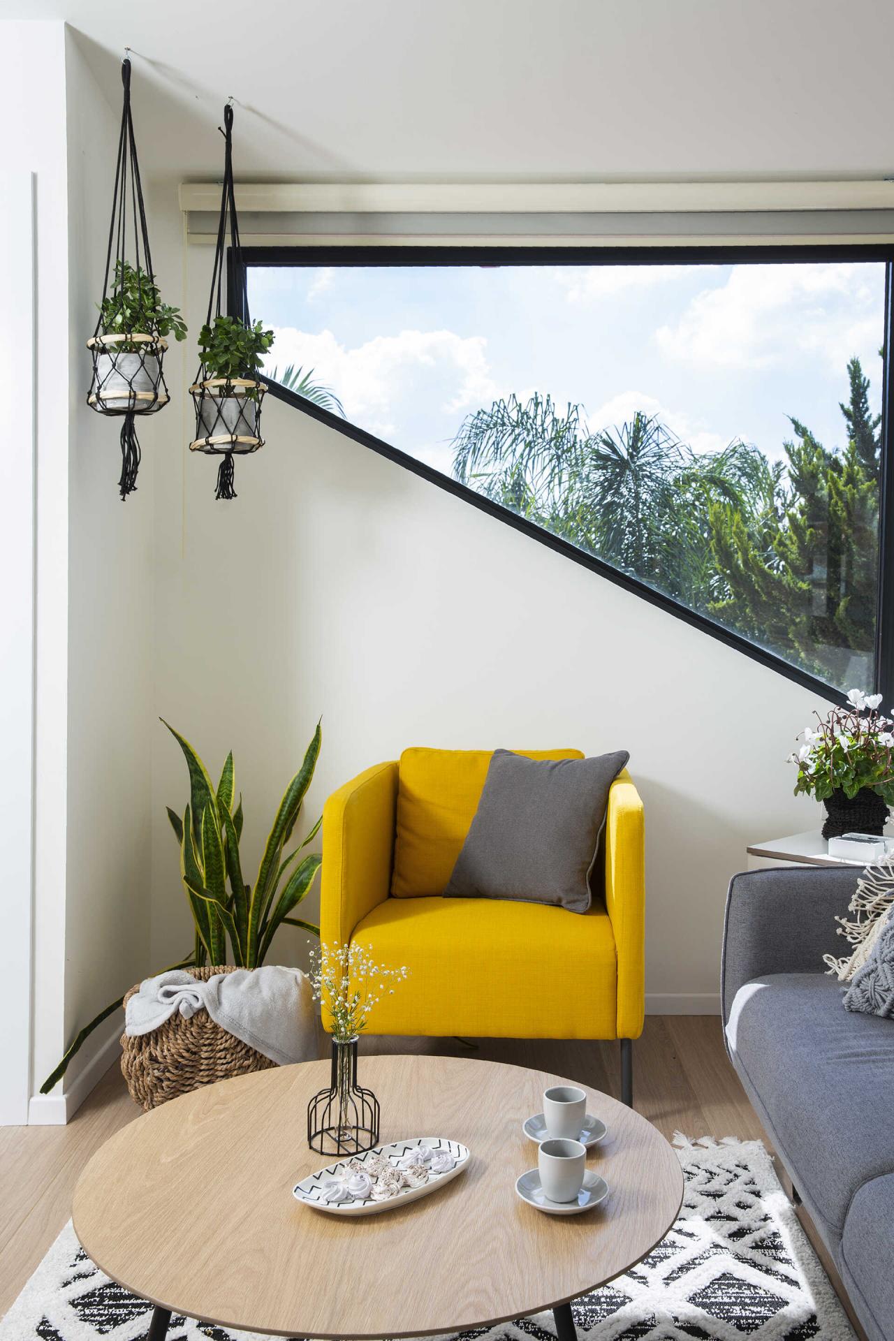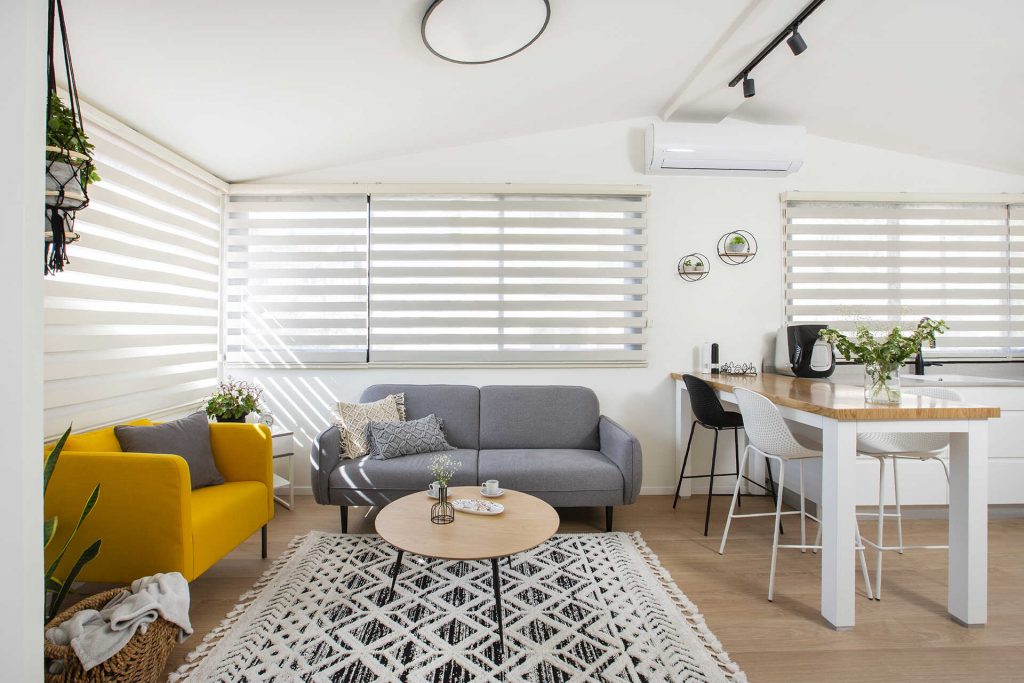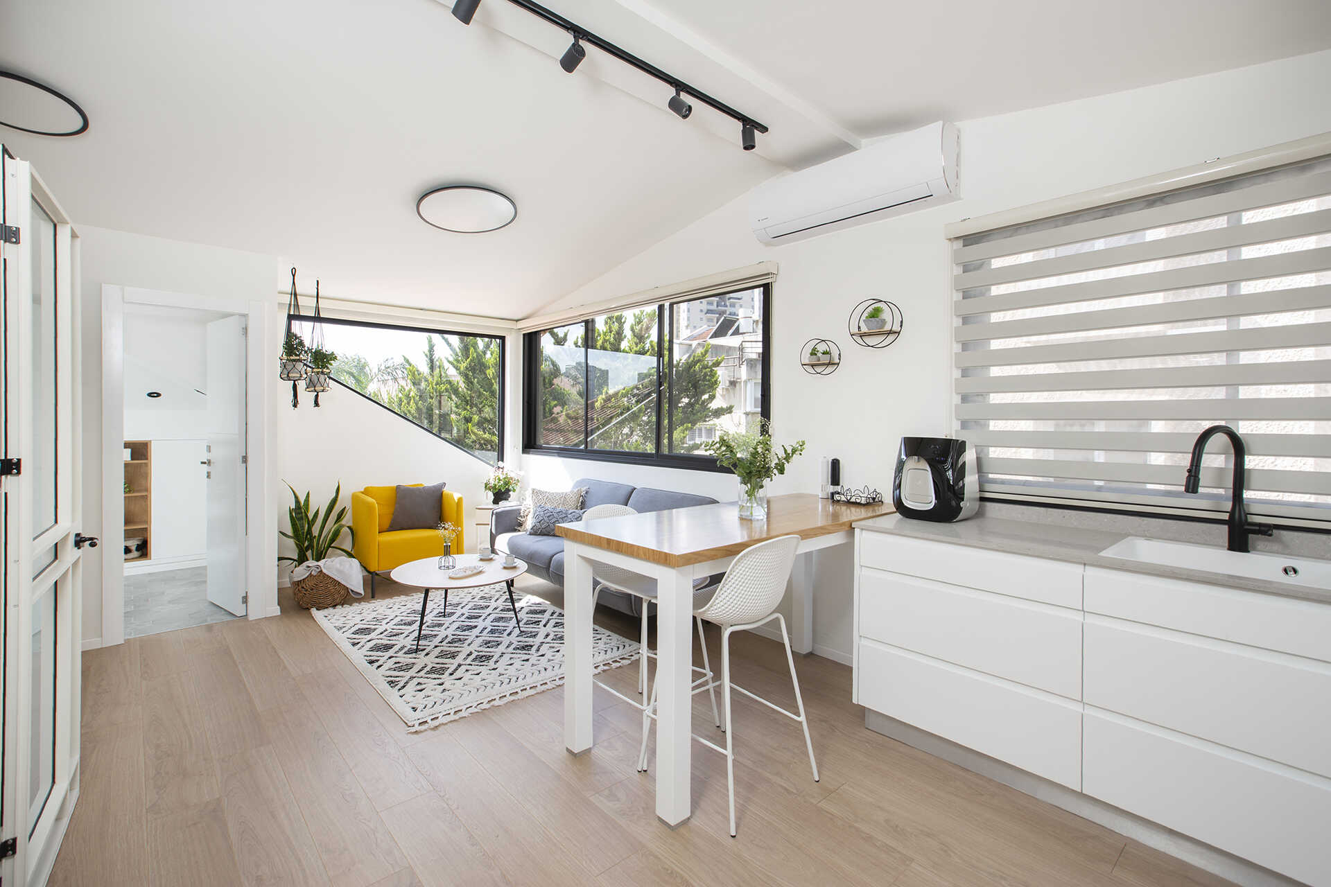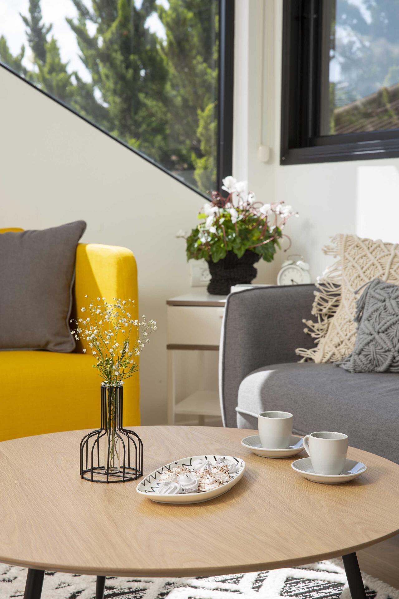 נעשה שימוש בגוונים בהירים, ריהוט קל ונייד, עם אופציות לשנות את מיקומי הפונקציות בהתאם לצרכים עתידיים.