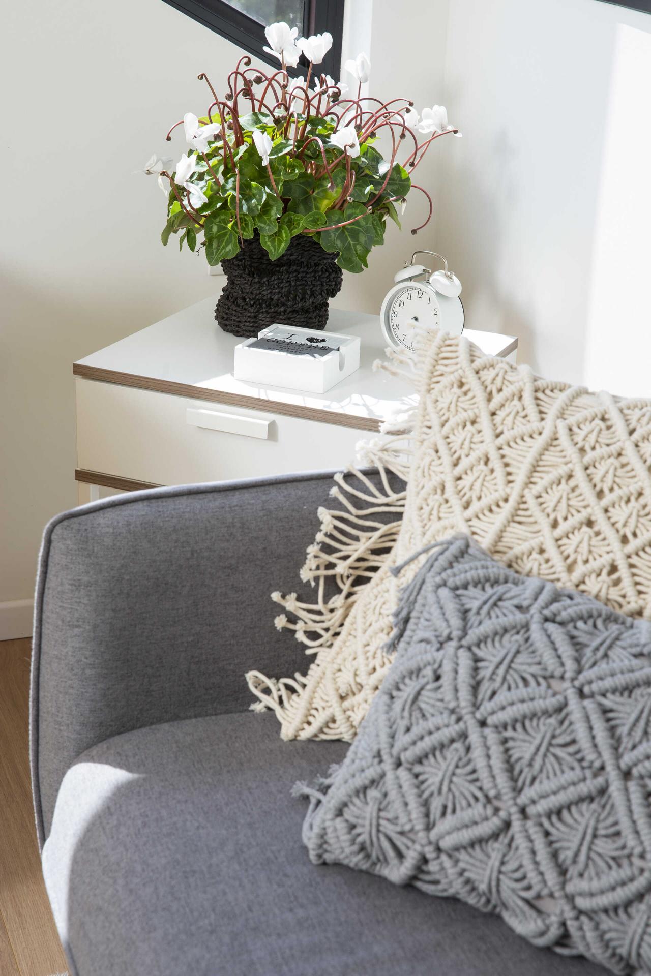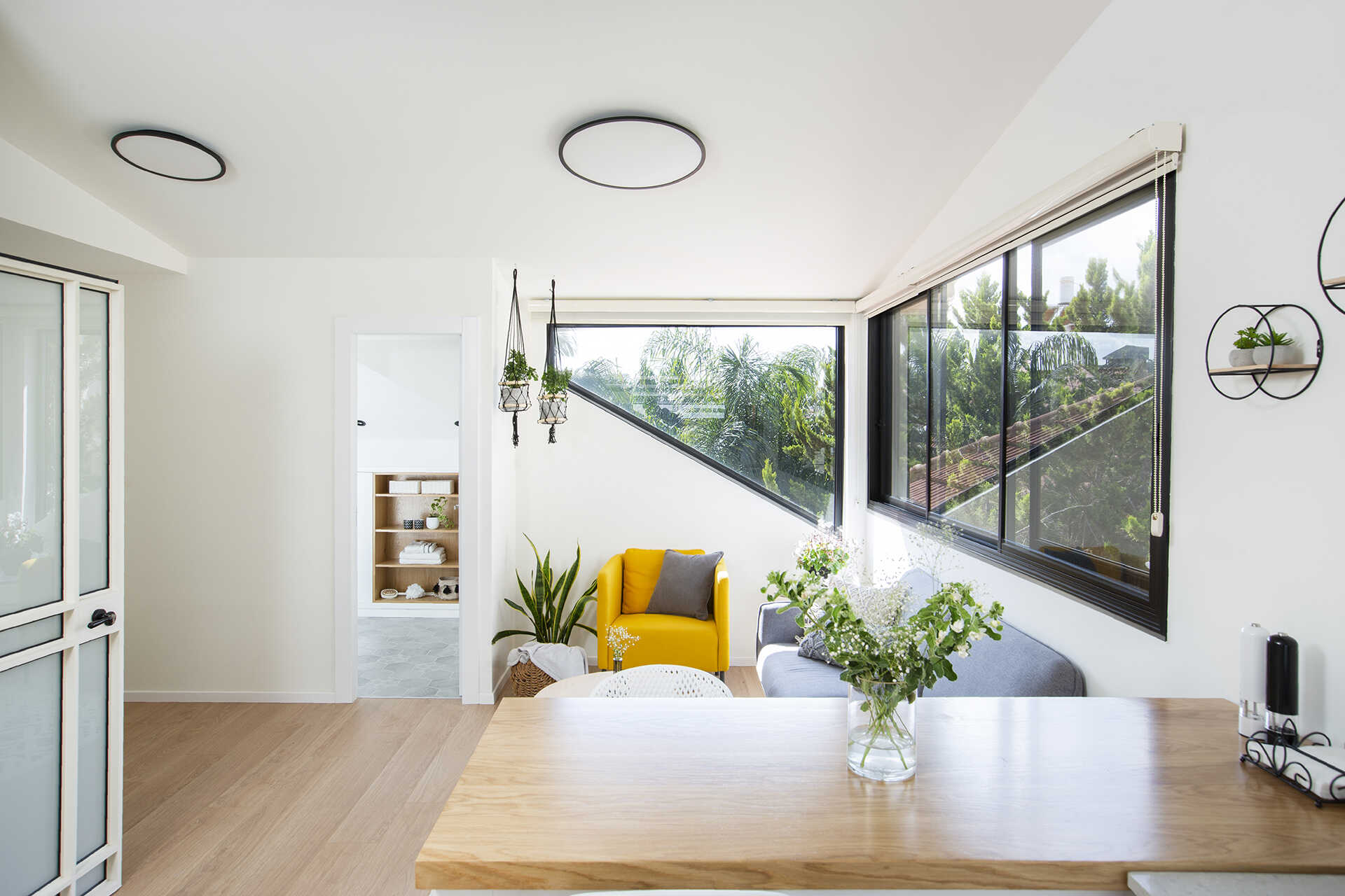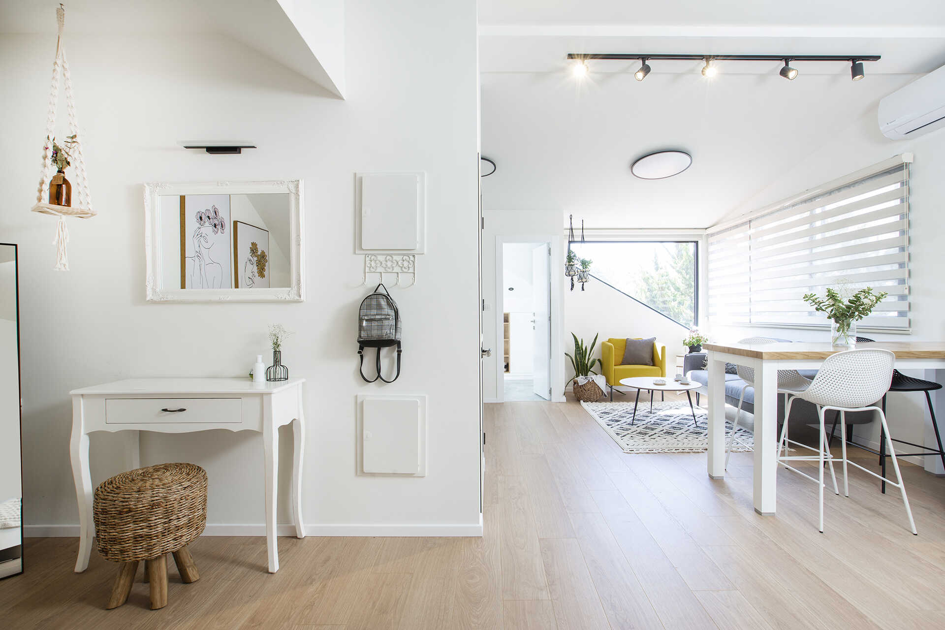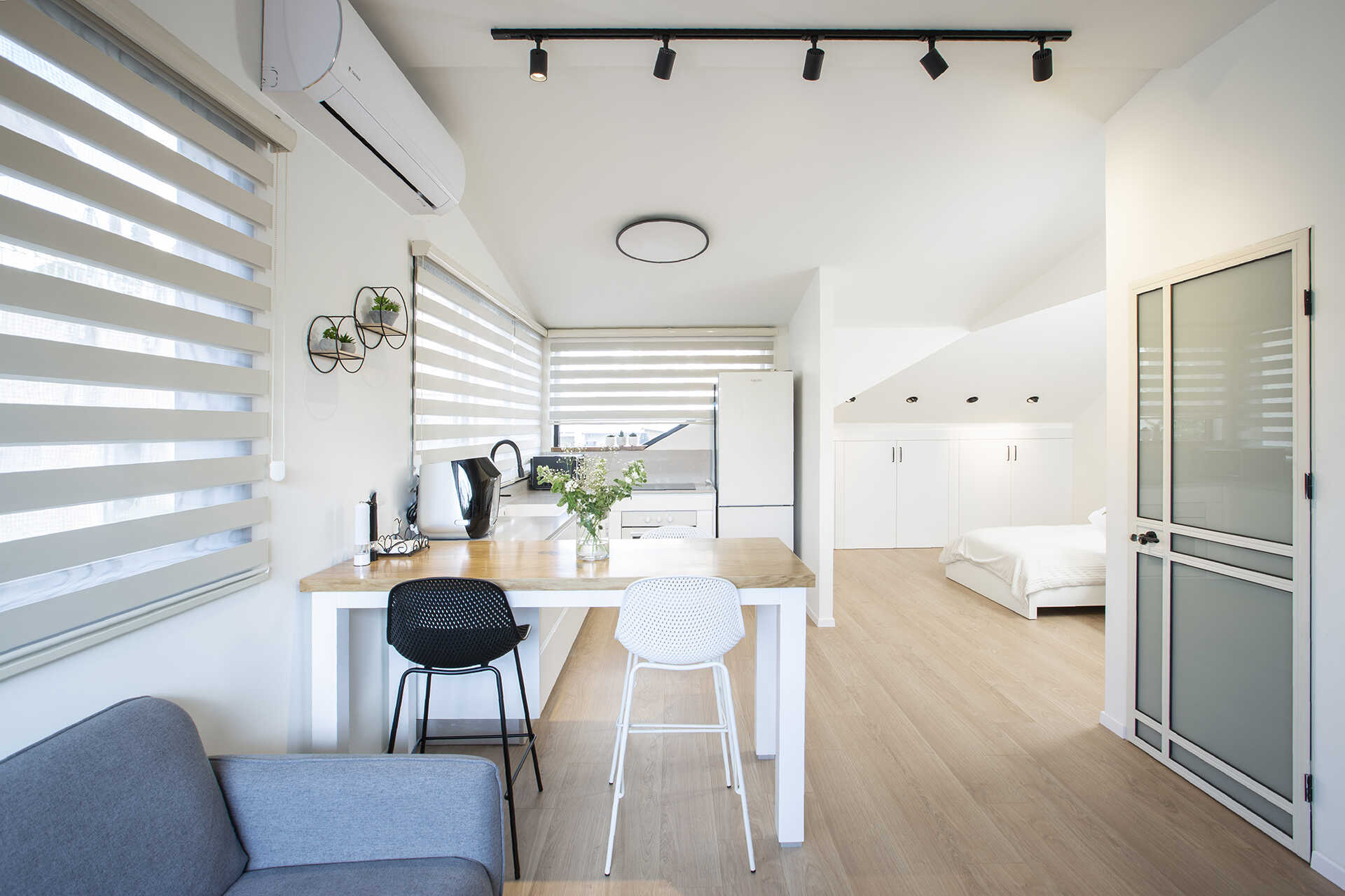 נעשה שימוש בגוונים בהירים, ריהוט קל ונייד, עם אופציות לשנות את מיקומי הפונקציות בהתאם לצרכים עתידיים.