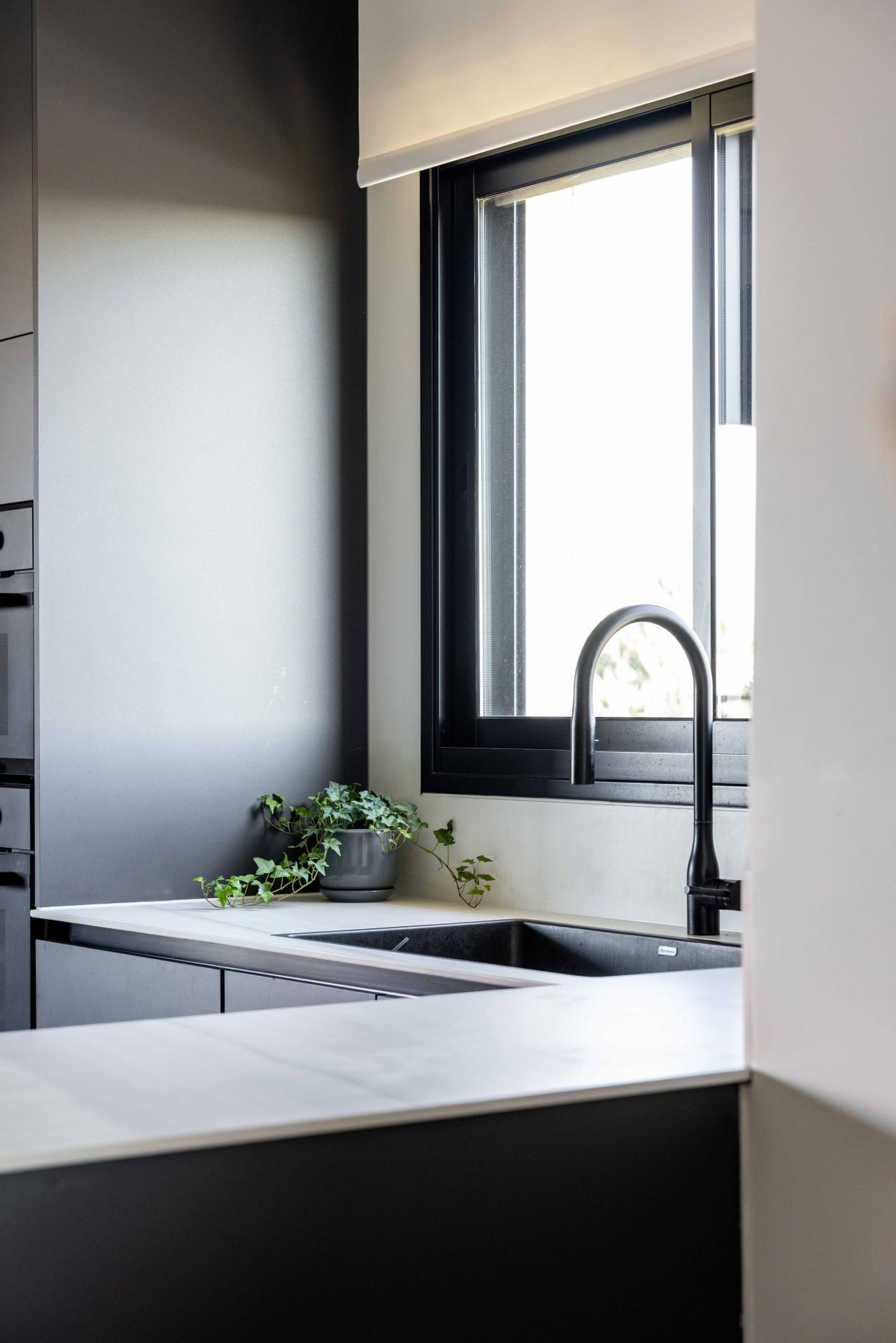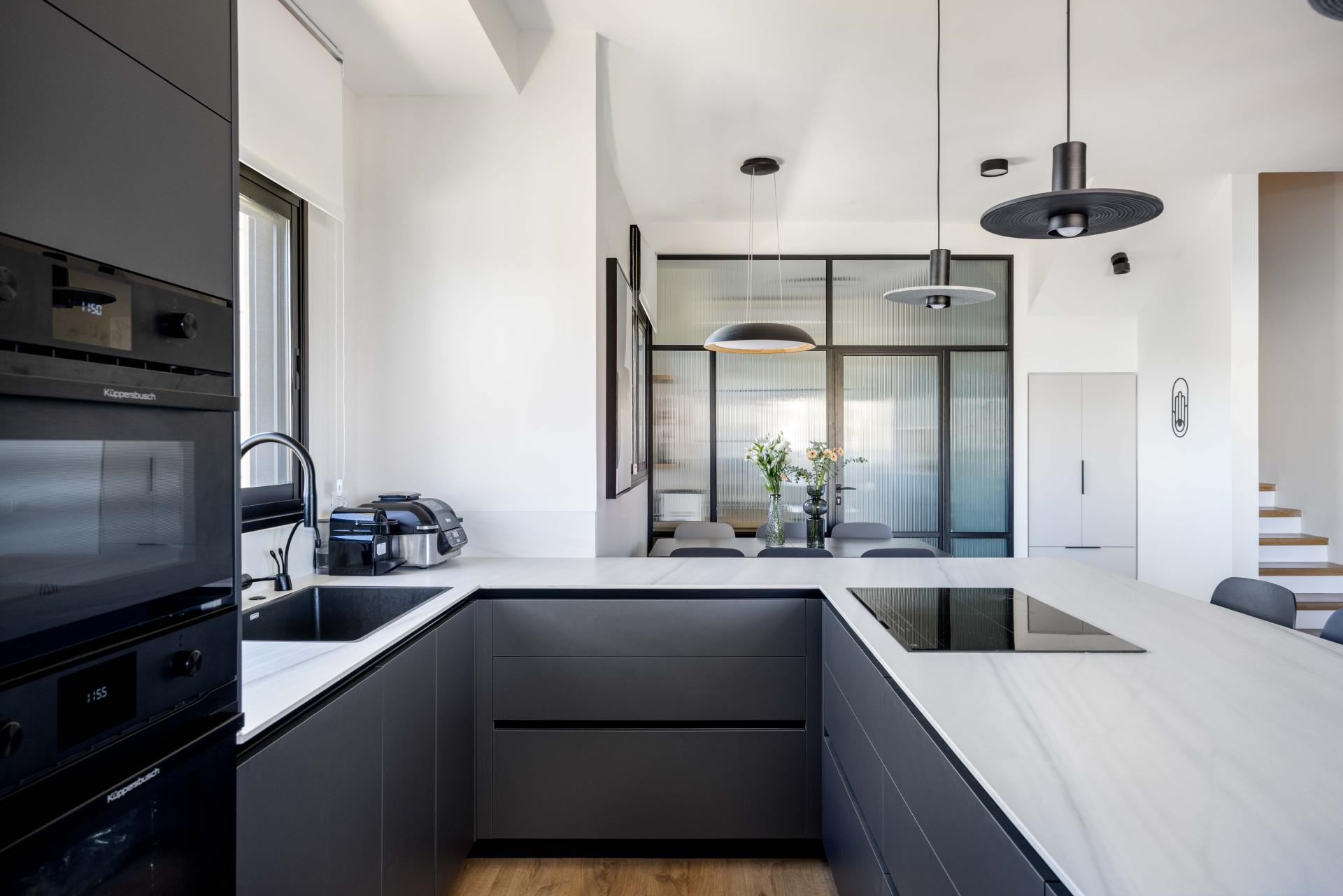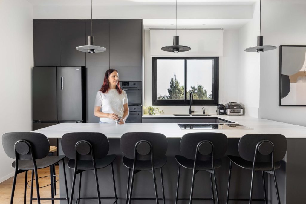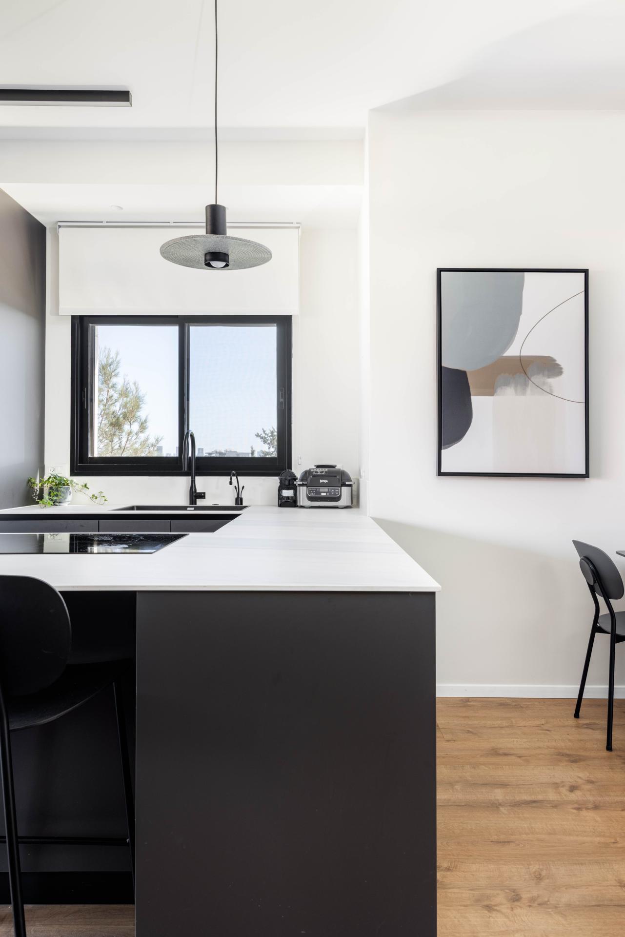 המטבח עבר תכנון ועיצוב מחדש, עם אי גדול ומרווח הכולל כיריים וסביבו מקומות ישיבה נוחים לכל בני הבית. בזכות כך הפך המטבח לפרקטי, מזמין ונוח לשימוש יומיומי.