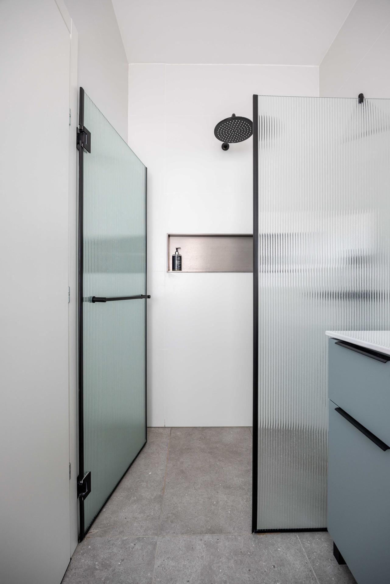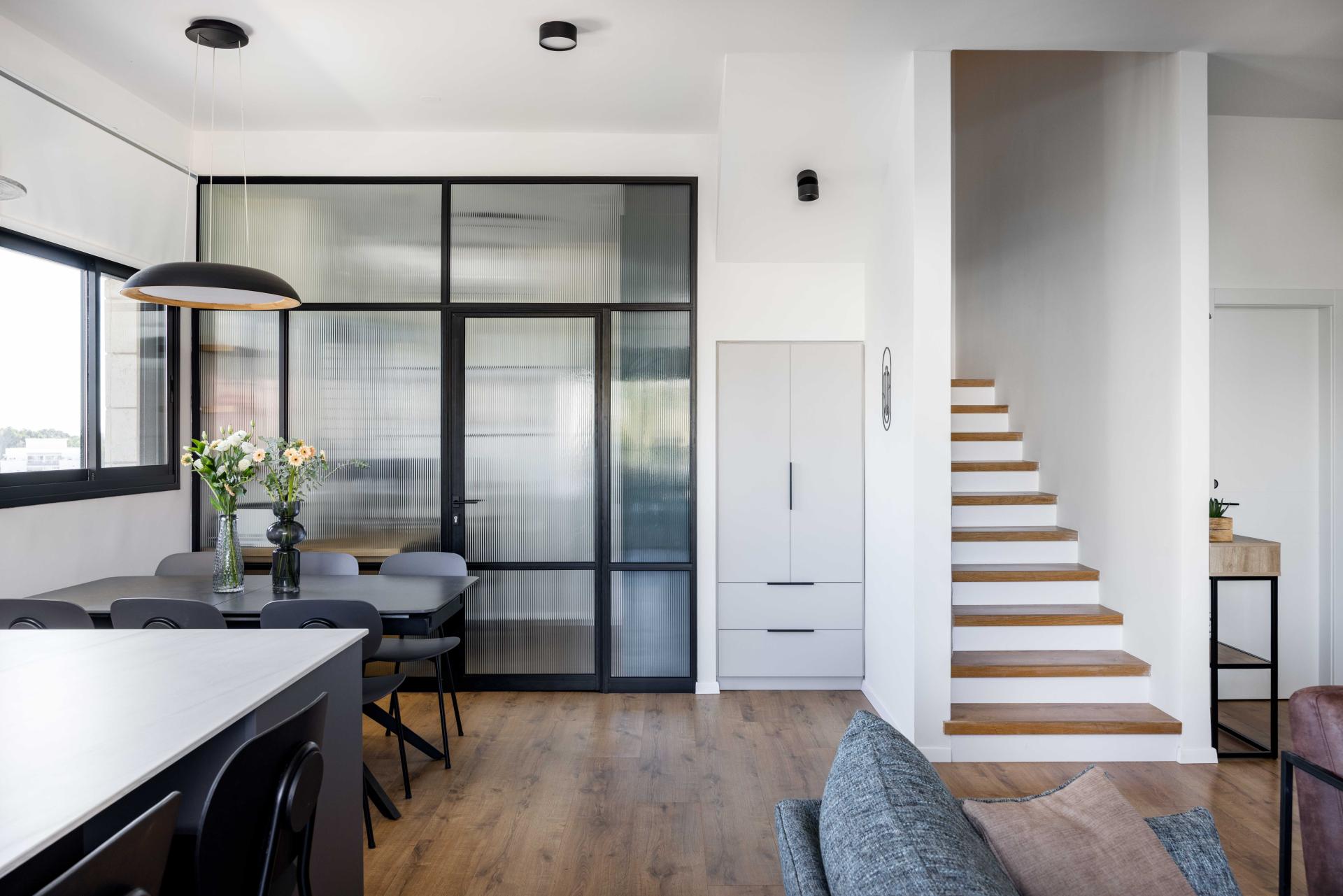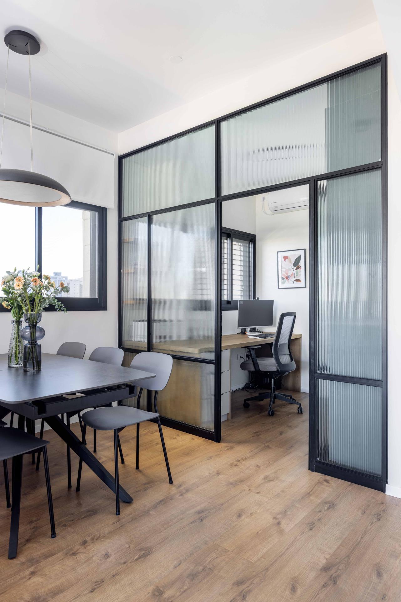 אחד האתגרים המרכזיים בבית היה היעדר מרחב עבודה ייעודי. עד השיפוץ, בעלת הבית עבדה בחדר של אחד הילדים, ללא הפרדה אמיתית בין חיי היומיום לצורך בריכוז ושקט.במסגרת התכנון מחדש יצרתי עבורה חדר עבודה פרטי, מוגדר ושקט, כזה שמאפשר לעבוד בנוחות וברוגע, במקביל לקרבה הנדרשת לשאר בני המשפחה.מחיצת האלומיניום והזכוכית שנבחרו לחדר העבודה, הפכו לאלמנט עיצובי משמעותי ומרשים בקומה כולה.