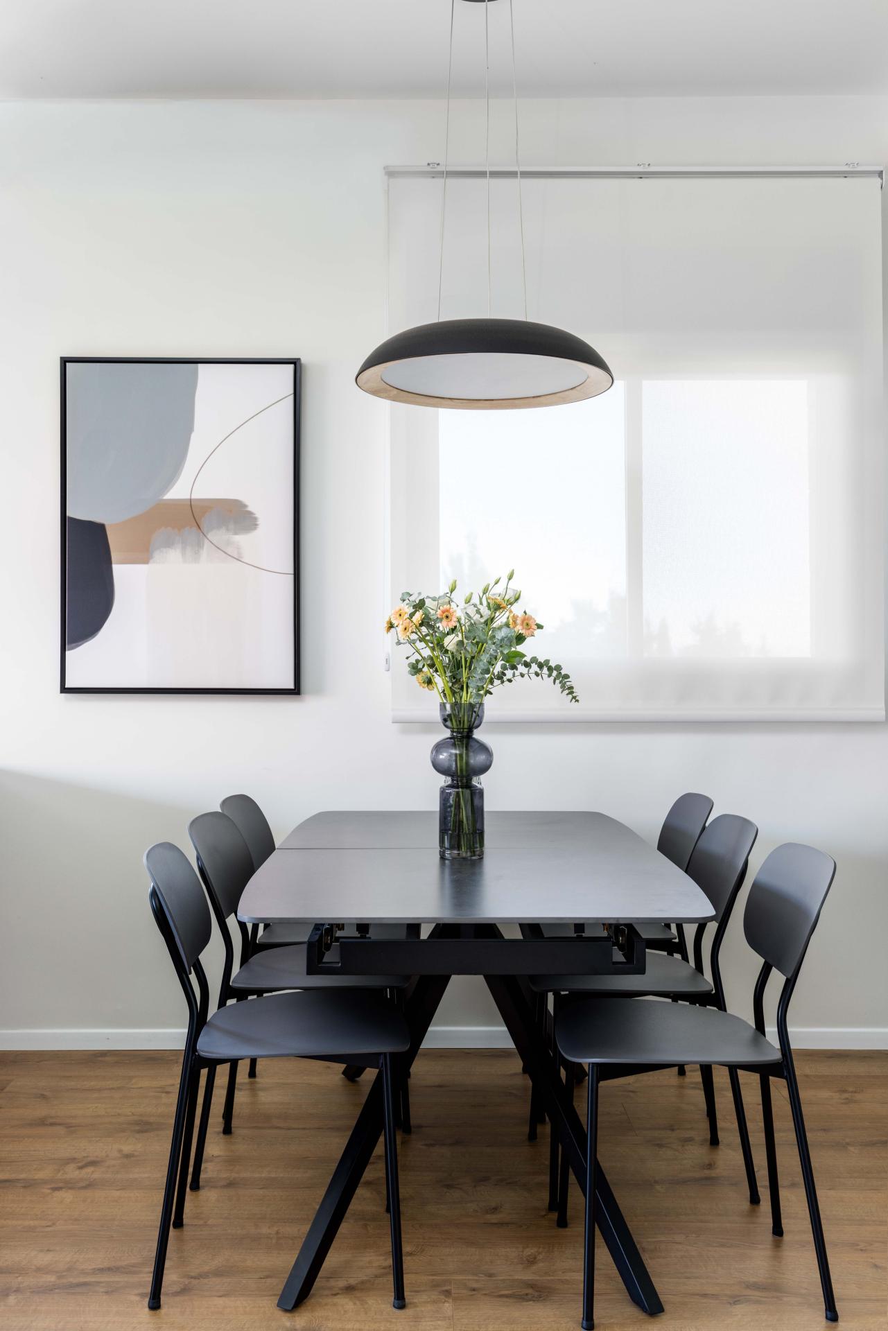 גם פינת אוכל לא הייתה קיימת בבית. באמצעות תכנון מדויק של החלל הציבורי יצרתי איזור חדש ומוגדר לפינת אוכל, מרחב מזמין לאירוח ולמפגשים משפחתיים וחברתיים.